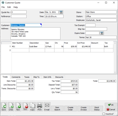 Create sales orders for your customers with firm prices and expiry dates. Use Quasar's direct email function to email a copy of an order directly to the customer in PDF format. When the customer is ready to receive the product, the order can be used to generate a customer invoice..
