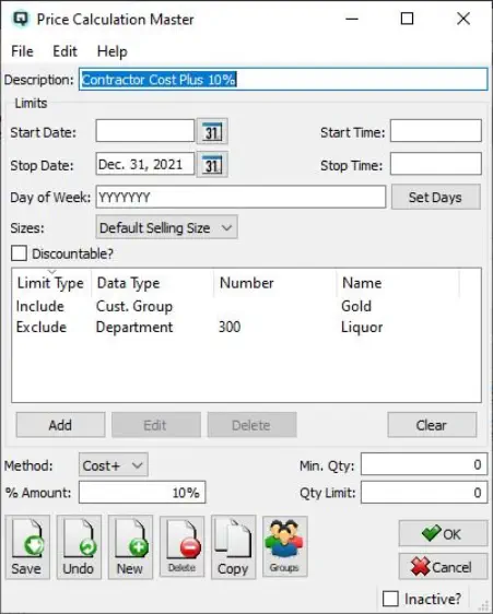 Calculated prices are a special tool used to generate spe- cial prices for special customers. Create cost plus, percentage off, dollar off, or at/for pricing. Set the start date, end date, start time, end time and valid days of the week that the calculated price will be valid. Include or exclude stores, store groups, customers, cus- tomer groups, items, item groups, departments or sub- departments.