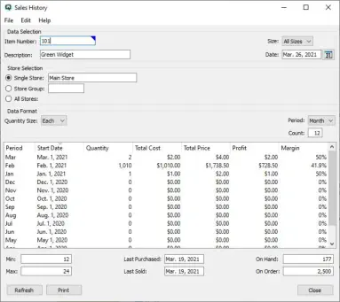View the stock status of any item at any time. View the sales history of an item by month, week or day. In special information screens you can view: An items sales, purchases and adjustment activities in both summary and detail. All transactions containing a specific item or group of items. All sales of a specific item or group of items. All purchases of a specific item or group of items. In all of the above cases you can drill down and view the actual transactions. You can report on items pur- chased by specific customers and you can report on items sold to you by specific vendors. You can very quickly find any transaction with a specific item on it.