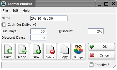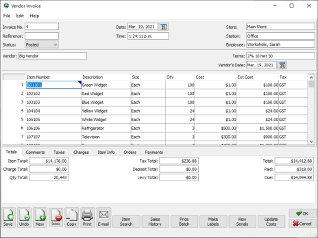 Create your receiving document (vendor invoice) manu- ally or generate it from the order. Quasar automatically closes the order when all items are received. If back-orders are accepted from a vendor then an order remains open until all items are received. However, if back-orders are not accepted then an order is closed as soon as some items on the order are received. Payment terms can be defined to take advantage of vendor payment discounts. When required vendor claims can be generated from the vendor invoice. Update costs and prices from the vendor invoice. Add charges such as franchise fees or freight to the vendor invoice.