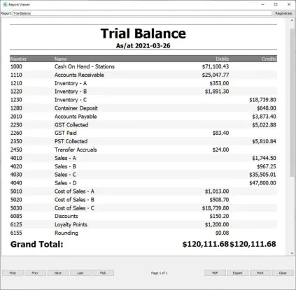 As in any accounting system the three most common re- ports are the trial balance, the balance sheet and the profit and loss statement. In addition Quasar offers: A ledger posting detail between a start and end date, for one or all accounts, for one or all stores(locations), or for a group of stores. A ledger posting summary report for all accounts be- tween a start and end date, for one or all stores(loca- tions), or for a group of stores. A point of sale transaction posting report. Ability to define as many reports as you may require.