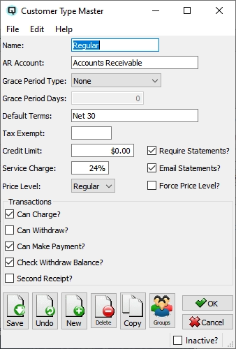 As the name suggests, customer types define a special type of customer. For example, commercial customers, non-charge customers or regular charge customers. In the Customer type screen you can set multiple defaults which make adding new individual customers much quicker. Quasar supports multiple receivable ledger accounts. Payment terms provide the ability for customers to re- ceive payment discounts when they pay their bills within your terms. You can set default taxes, if any, that the customer type is exempt from. If service charges will be applied to past due accounts you can define default service charge rates. With the regular price level and four addition price levels you set the default price level by customer type. Default customer controls will define the type of trans- actions the customer can participate in. Can the cus- tomer charge? Can the customer withdraw cash from their account, and if they can, must they have a credit balance.