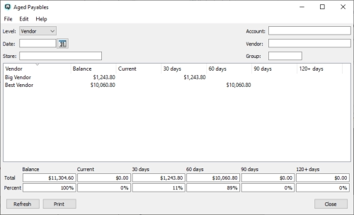 In addition to standard reports Quasar has three screens that are very useful in viewing payable information. All three screens provide the ability to drill down directly to the transaction. The vendor purchases screen provides a detailed list of items purchased from a vendor between a start date and an end date. The report can be filtered by depart- ment, sub-department or item. The aged payables screen provides a broad look at all payables, a look at payments due to one vendor or a look at individual transactions. The inquiry screens lists all transactions between a start and end date while providing an opening and closing balance for the period defined..